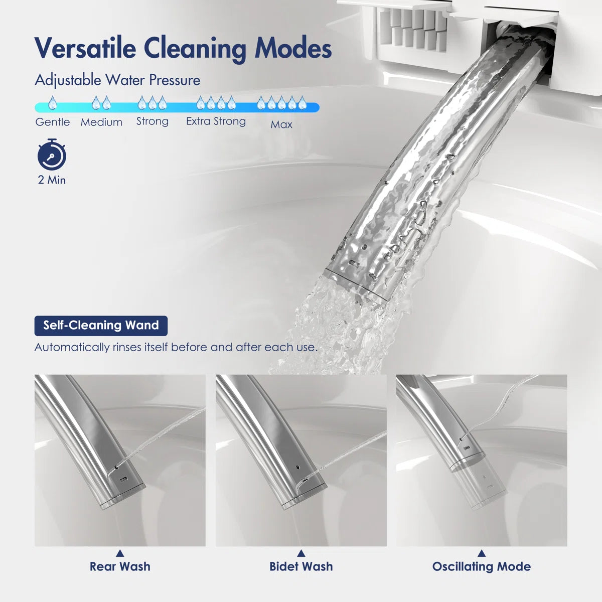 Hygienic Self-Cleaning Wand: Automatically rinses the durable bidet nozzle before and after every use, maintaining optimal sanitary conditions without any manual effort.
