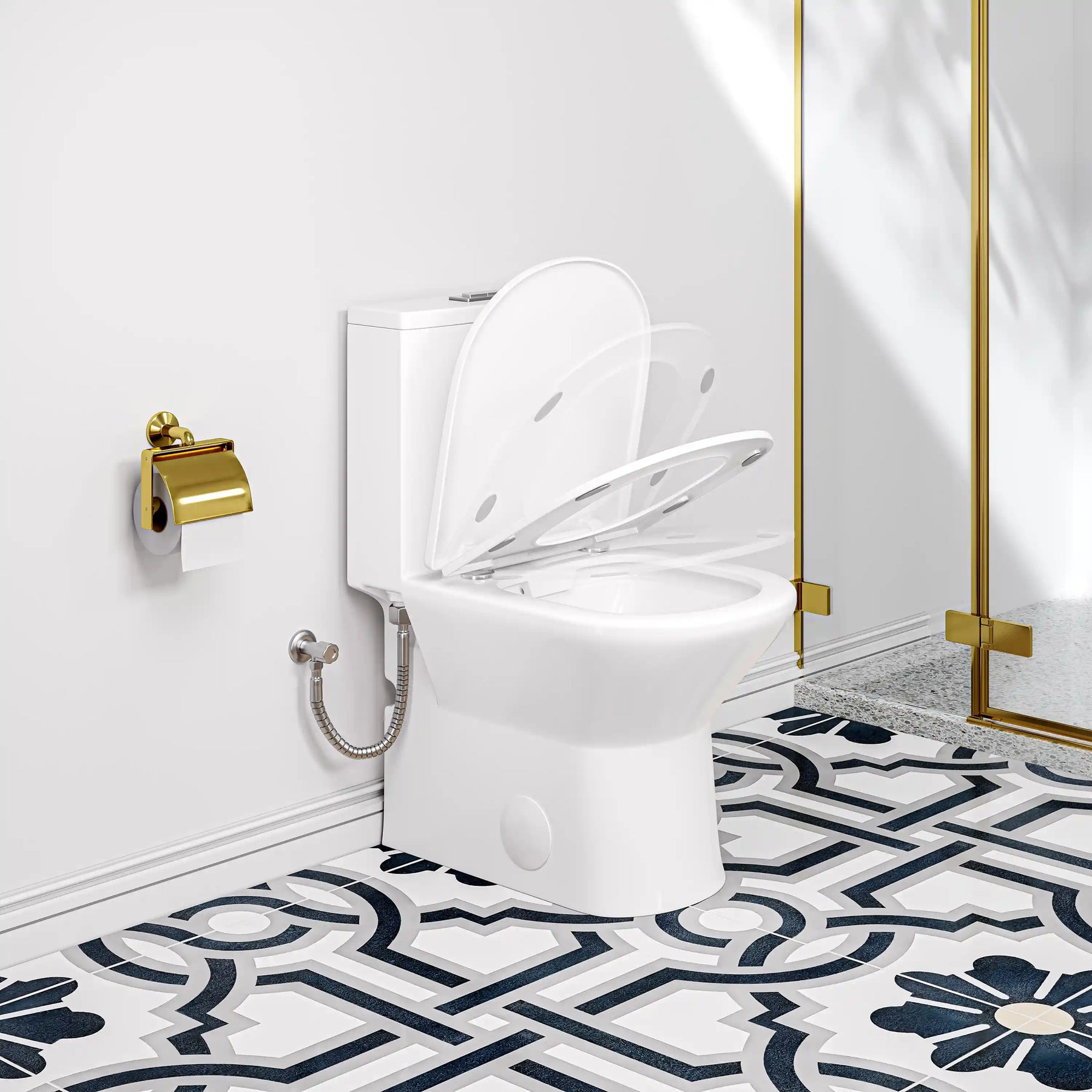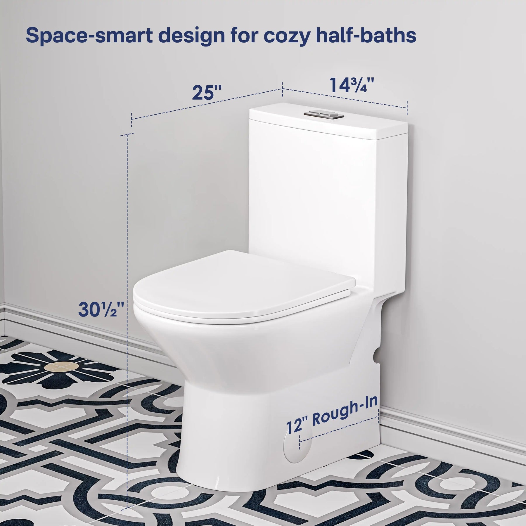 The Naples Compact Elongated One-Piece Toilet offers strong dual flush performance within a space-saving 25" depth design. Crafted from durable vitreous china and paired with a soft-closing seat, it delivers everyday reliability, efficient flushing, and a clean modern profile ideal for small to medium bathrooms.